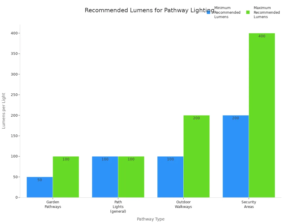 Interest habere vias tutas foras. Semita accensis adiuvat homines ubi ambulant. Etiam sistit itinera et cadit. Pro semitae horti, luminaribus cum 50-100 lumens utuntur. Ambulacra opus 100-200 lumens ad lucem bonam. Si plus securitatis vis, 200-400 lumens per lucem utere. Pone velit ductus luminum 6-8 pedes etiam sine luce. Viae angustae lumina propius inter se egent. Latae semitae lumina longius distantes habere possunt. Pone luminaria circiter 14 pollices super terram. Inde directum trabem dat et lepidam semitam facit.